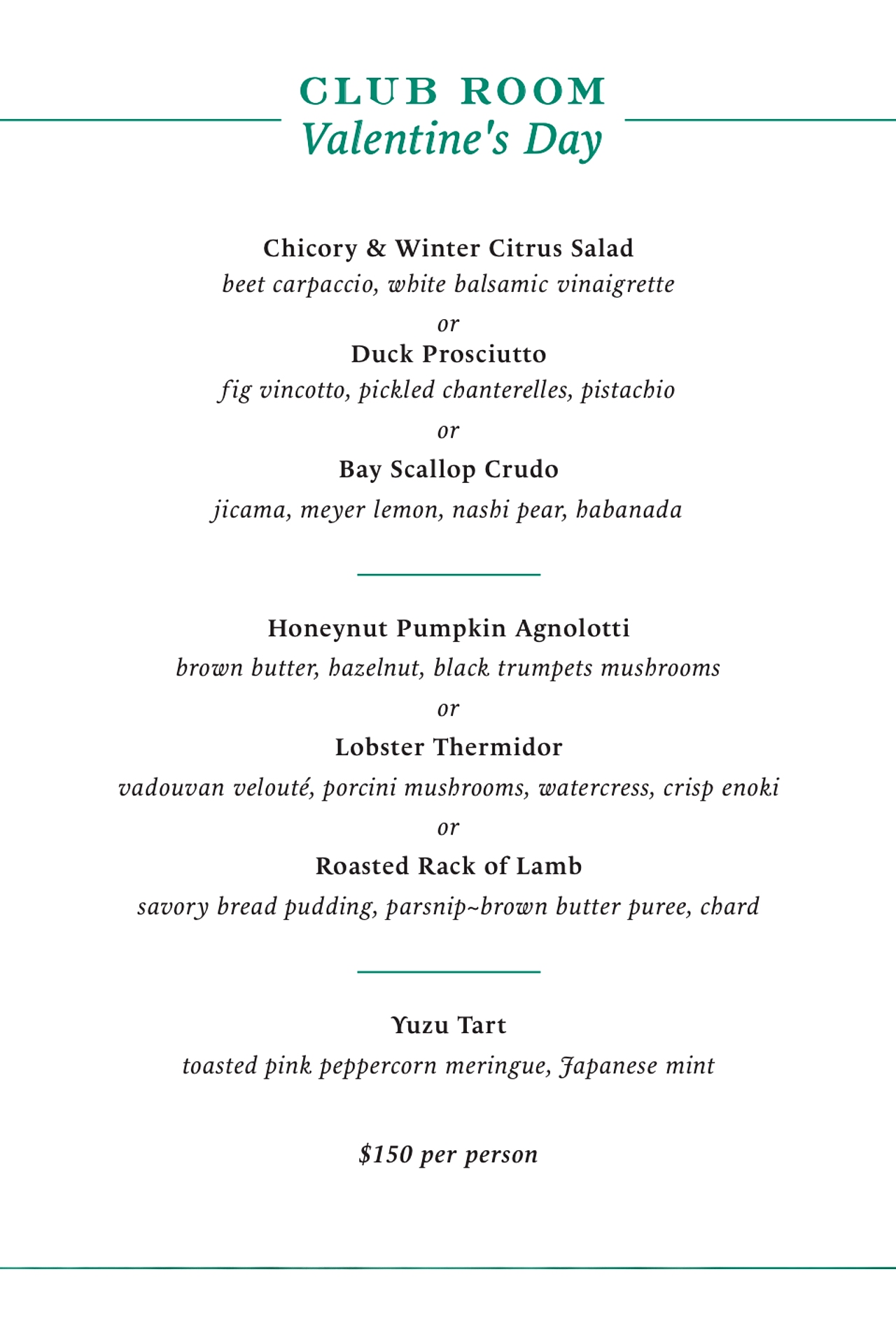 Reserve your seating HERE for Saturday, February 14th. Walk-Ins will be accommodated in our Bar Room with first-come, first-served seating. Our Valentine’s three course dinner menu will be served. Please note that our Bar Room does not offer a view of the stage for live music.